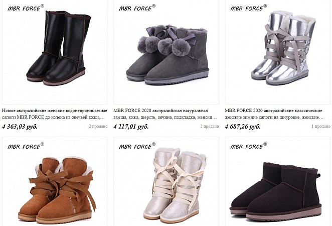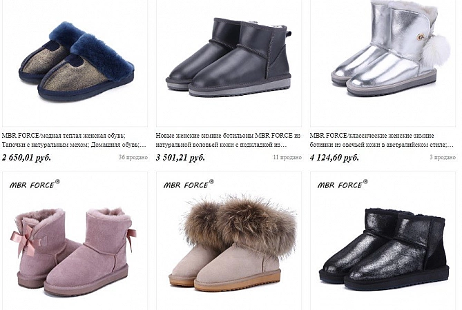 العلامة التجارية MBR FORCE هي المسؤولة عن توفير أزواج الأحذية الشتوية الأكثر سطوعًا والأكثر غرابة. هنا يمكنك طلب أحذية الكاحل النسائية وأحذية الكاحل بجميع ألوان قوس قزح. بشكل ملحوظ ، يتم استخدام كل من المواد الاصطناعية والطبيعية في عملية التصنيع - الجلود ، والجلد المدبوغ ، والصوف ، إلخ. بالنظر إلى هذا ، تبدو الأسعار منطقية تمامًا ، على الرغم من أنها أعلى من أسعار المنافسين. تشير المراجعات إلى أن مظهر الأحذية وحجمها يتوافقان مع الصور من Aliexpress. Uggs دافئة بما يكفي لفصل الشتاء ، والألوان مشبعة. يتم خياطة جميع التفاصيل بدقة ، والفراء ناعم وممتع للجسم ، ولكن في بعض الأحيان يتساقط ويبقى على الجوارب. كان لدى العملاء أيضًا شكاوى حول حقيقة أن النعل ينزلق.