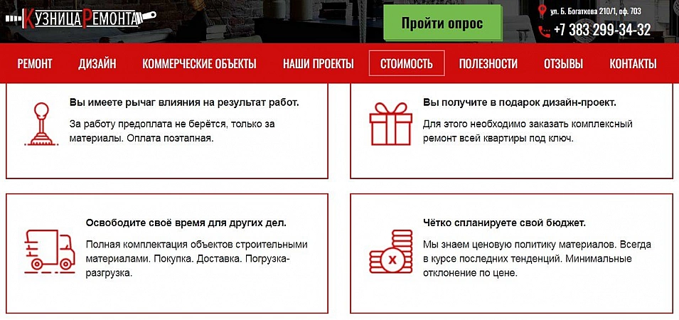 Forge of Repair предлага на клиента безплатни консултации, поетапно плащане, допълнителни подаръци, пълна поддръжка на обекта и възможност за избор на всяка индивидуална услуга, без да се прибягва до комплексен ремонт.