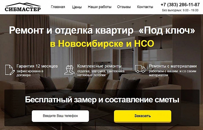 Рейтингът продължава популярна компания за ремонт на апартаменти в Новосибирск, която се ползва с доверието на клиентите. В компанията "Sibmaster" можете да поръчате ремонт сравнително евтино, така че работата до ключ ще струва от 3490 рубли на квадратен метър, довършването според дизайнерския проект - от 6990 рубли. Те не предоставят услуги за вторичния жилищен фонд, те са специализирани само в нови сгради. Фирмата предлага пълен набор от услуги в своята област. Имаме собствен екип от ремонтни екипи, но те често включват специалисти на трети страни, което се отразява на продължителността на работата. Според отзивите на клиентите сътрудничеството с компанията е много удобно, майсторите се грижат за всички задължения, включително осигуряването на съоръжението с материали. Но в случай на откриване на недостатъци, оплакванията са изключително неохотни да отговорят.