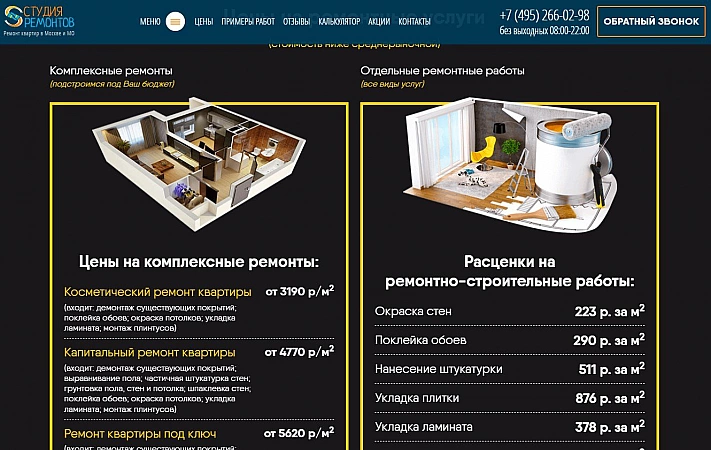 Studio Remont е основана през 2014 г. в Москва, а няколко години по-късно започва да отваря клонове в други големи градове на страната, включително Новосибирск. Въпреки факта, че компанията присъства в Сибир не толкова отдавна, тя вече е изградила добра репутация и често се препоръчва като надежден изпълнител. Фирмата работи с ново строителство и недвижими имоти на вторичния пазар. Поемат се всички проблеми, включително и снабдяването на обекта с материали, излишъкът от последните се изкупува след приключване на ремонта. Цялата работа е с гаранция до три години. След подписване на договора започват ремонтни дейности без предплащане, като клиента извършва плащания на етапи, в съответствие с изпълнението им. Има редовни промоции, които ви позволяват да спестите пари. Според прегледите на клиентите, компанията е точна, обектите се предават навреме. Недостатъците включват лош контрол върху работата на майсторите, много недостатъци трябва да бъдат коригирани. Също така се препоръчва внимателно да приемете работата, тъй като компанията не е склонна да отговаря на оплаквания.