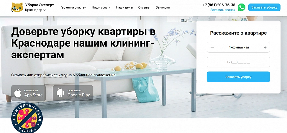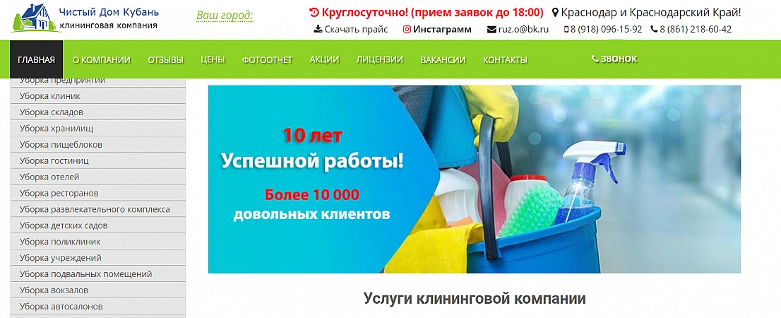 Clean House Kuban er den ubestridte markedsleder i forhold til antallet af tjenester. De udfører enhver form for arbejde: rengøring af lejligheder, sommerhuse, kontorer, hoteller, banegårde og andre offentlige og industrielle lokaler, vask af vinduer, altaner og loggiaer, vask, strygning, renovation, græsslåning mv. Samtidig er priserne meget lave, og det er ikke overraskende, at virksomheden er meget populær blandt indbyggerne i Krasnodar. Besætninger tager afsted når som helst på dagen eller natten, syv dage om ugen, og kan om nødvendigt ankomme til stedet inden for et par timer efter opkaldet. Generelt kan du regne med den mest hurtige løsning på problemet.