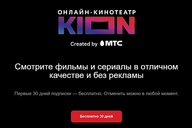 Ο διαδικτυακός κινηματογράφος ΚΙΟΝ θα είναι κυρίως χρήσιμος για χρήστες κινητού Διαδικτύου από το MTS, καθώς παρέχεται δωρεάν στο τιμολόγιο For Notebook.Επίσης δεν καταναλώνει κίνηση! Υπάρχουν όμως περιορισμοί στη βάση περιεχομένου: λίγο περισσότερες από 3.800 ταινίες, 600 σειρές και 200 κανάλια. Και για να αποκτήσετε πρόσβαση στο ivi, το START και το Amediateka, θα πρέπει να αγοράσετε επιπλέον πακέτα τιμών. Η υπηρεσία εμφανίστηκε το 2021, αλλά έχει ήδη περισσότερες από 10.000 ταινίες, σειρές και η βιβλιοθήκη επεκτείνεται συνεχώς. Υπάρχουν λίγες κριτικές για την υπηρεσία, αλλά τις περισσότερες φορές περιέχουν δυσαρέσκεια με την πλοήγηση και τον έλεγχο. Είναι πολύ βολικό να παρακολουθείτε από φορητό υπολογιστή, tablet και τηλέφωνο, αλλά προκύπτουν προβλήματα σύνδεσης με τον αποκωδικοποιητή. Όπως οι περισσότερες άλλες υπηρεσίες ροής, τα νέα αντικείμενα και τα blockbusters πρέπει να αγοράζονται ξεχωριστά.