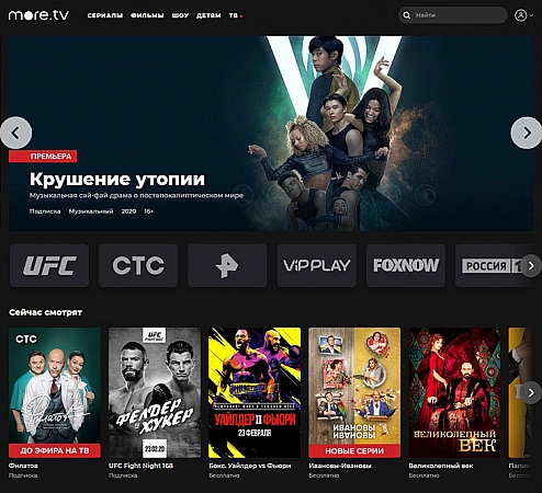 Ένας διαδικτυακός κινηματογράφος για παρακολούθηση ταινιών, τηλεόρασης και σειρών σε Full HD more.tv είναι ένα είδος «μέσου όρου» για όχι πολύ απαιτητικούς χρήστες.Μια θάλασσα από τηλεοπτικά κανάλια, καθώς και σικ επιλογές ρωσικών και ξένων τηλεοπτικών εκπομπών για μια πολύ οικονομική συνδρομή και χωρίς να σας πιέζουν να αγοράσετε υπερπαραγωγές. Η υπηρεσία δεν είναι ενοχλητική, και το πιο σημαντικό, πρακτικά δεν είναι buggy. Μόνο που εδώ η βιβλιοθήκη είναι απίθανο να μπορέσει να ανταγωνιστεί την ivi, αλλά θα ξεπεράσει εύκολα την Amediateka. Ένα τεράστιο πλεονέκτημα είναι ότι οι συνδρομές σε μεγαλύτερες υπηρεσίες μπορούν να περιλαμβάνουν επιλεγμένο και πρωτότυπο περιεχόμενο του more.tv. Είναι βολικό στη χρήση, μπορείτε να το απενεργοποιήσετε χωρίς προβλήματα, υπάρχει δωρεάν περιεχόμενο σε διάφορες μορφές, συμπεριλαμβανομένων ταινιών από τη δεκαετία του 1970 και παλαιότερες. Μια εξαιρετική επιλογή για όσους αγαπούν ορισμένα κανάλια, ρωσικές τηλεοπτικές σειρές και βλέπουν ξένες ταινίες μια-δυο φορές την εβδομάδα.