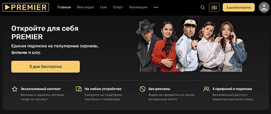 Όπως και το START, η Premier επικεντρώνεται στην παροχή ποιοτικών ρωσικών ταινιών και σειρών. Μπορείτε να συνδέσετε έως και 5 συσκευές, αλλά 2 θα λειτουργούν ταυτόχρονα. Υπάρχουν προβλήματα στο Android και στην smart TV, αλλά σπάνια αναφέρονται στις κριτικές - πιο πιθανές απλές ατέλειες παρά δυσλειτουργίες. Με την αγορά μιας συνδρομής για ένα μήνα, δεν χρειάζεται να πληρώσετε επιπλέον για ταινίες ξεχωριστά. Παρεμπιπτόντως, εκτός από το ρωσικό περιεχόμενο, υπάρχει μια μεγάλη βιβλιοθήκη με εξαιρετικές ξένες ταινίες και σειρές μεγάλου μήκους.Καθώς και ένα μεγάλο σύνολο ζωντανών εκπομπών και talk show. Οι χρήστες που αγοράζουν μια συνδρομή είναι ικανοποιημένοι με την ποιότητα και την πρωτοτυπία του περιεχομένου. Καθώς και πρόσβαση σε όλα τα έργα TNT πιο γρήγορα από την απλή τηλεόραση.