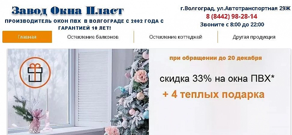 Large manufacturer of plastic windows in Volgograd. The plant has been operating since 2002, with more than 16,000 completed projects to its credit. Range of services - measurement, production, delivery, installation of windows. Prices for typical windows and balcony blocks are low. The cost of a standard double-wing design starts from 5250 rubles. Own production helps the company to meet the deadlines agreed with the client. It takes about 5 days from the moment of measurement to the completion of the order.In Volgograd, the company enjoys a good reputation, is considered one of the best and most reliable. The advantages of customers include the speed of order fulfillment, affordable prices, accurate work.