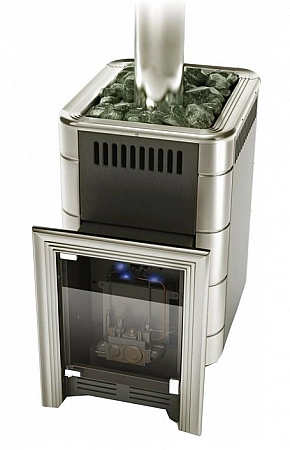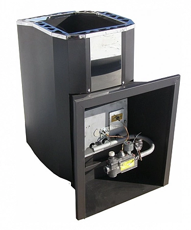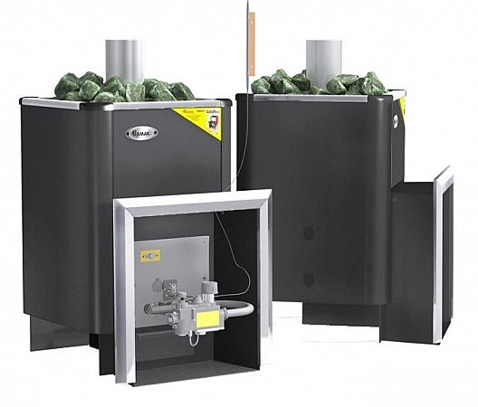 El gas es la forma más rápida y económica de calentar el calentador a la temperatura requerida. Suministrado a alta presión, casi instantáneamente pone el calentador en modo de funcionamiento. Además, los hornos a gas son más fáciles de regular. Siempre hay una válvula en la boquilla que le permite ajustar exactamente la temperatura que desea. Con leña, tal truco no funcionará. Pero los hornos de gas también tienen un inconveniente importante: la rápida quema de oxígeno en la habitación. Los baños con dicho equipo deben estar equipados con campanas extractoras, e idealmente, si la cámara de calentamiento no está ubicada en la sala de vapor, sino en el vestidor. Todos los modelos de esta categoría se fabrican en Rusia.
