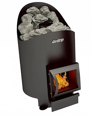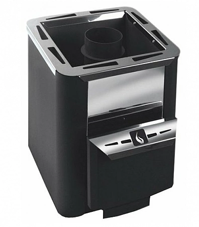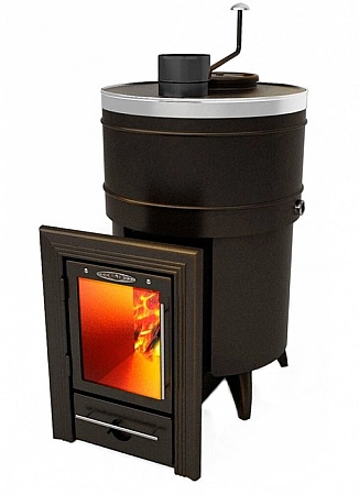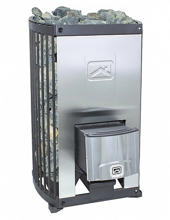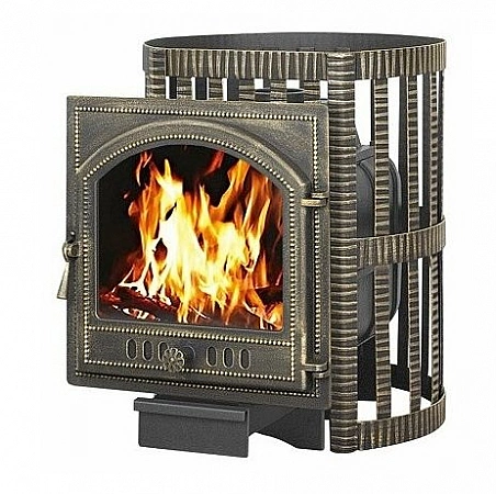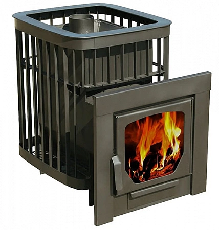 En la mayoría de los casos, la estufa-calentador está diseñada para un baño pequeño, pero si el volumen de su baño de vapor alcanza los 24 metros cúbicos, necesitará algo más. Y ahora tenemos una estufa así. Ella tiene el mayor volumen de espacio calentado. Al mismo tiempo, las dimensiones no son para decir tan grandes. Pero hay una cámara de combustión muy espaciosa con vidrio panorámico. Es conveniente colocar troncos en él, incluso los grandes. La rejilla de hierro alrededor de la caldera está diseñada para colocar piedras, es decir, el horno está abierto, pero debido a la alta temperatura en el horno, el calentamiento se produce rápidamente y todo se enfría durante bastante tiempo. Este es el mejor modelo para una sala de vapor con un volumen superior al promedio.