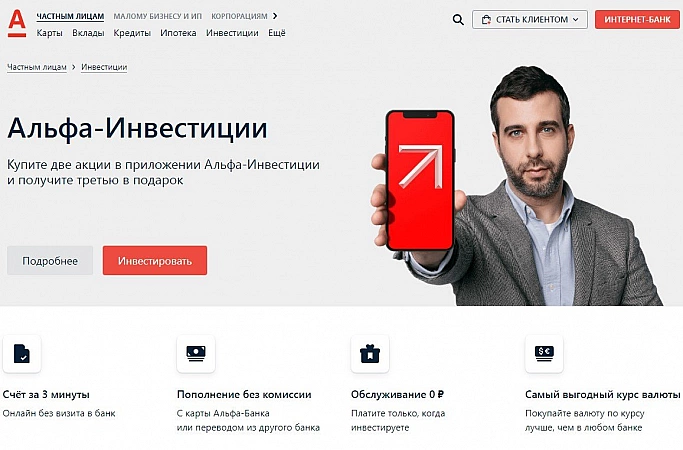 Alfa investeeringud | 100 hõõruda. | 0,04-0,3 % | Ei | on vaba | rahvusvahelised vahetused, Moskva börs, Peterburi börs, futuuriturg |