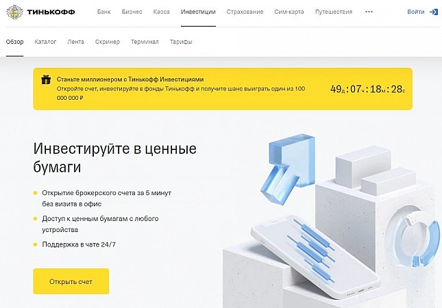 Tinkoffi investeeringud | 10 hõõruda. | 0,025-0,3 % | Jah | on vaba | Moskva börs, Peterburi börs, futuuriturg |