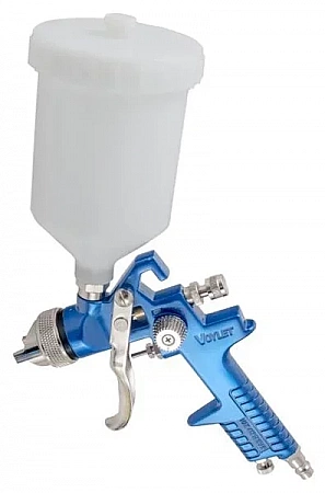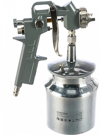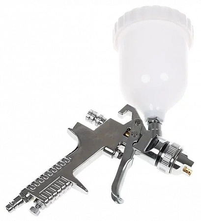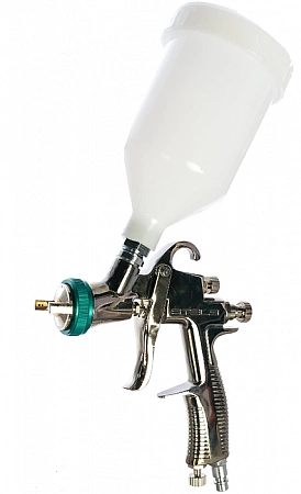 Pneumatikus szórópisztoly vízbázisú festékkel való munkavégzéshez 0,6 literes felső tartállyal, hermetikusan csavarozott fedéllel. A teljes működéshez olyan kompresszorra van szükség, amely akár 198 l / perc teljesítményt is biztosít. A készlet tartalmaz egy 1,4 mm-es fúvókát, de ugyanaz a gyártó különböző fúvókákat kínál, köztük 2,5 mm-es fúvókákat is a nagyon vastag készítményekhez. Az áteresztő furat cizellált, ami biztosítja a festékfolt pontos formáját. A fej anyaga – a sárgaréz hosszú élettartamot biztosít. Az áttekintésekben a felhasználók megjegyzik a fáklya alakjának kényelmes zökkenőmentes beállítását, valamint a vízbázisú festék egyenletes alkalmazását a mennyezeten és a falakon.A pisztoly nehezebb, mint az analógok (súlya körülbelül 1 kg), mivel ötvözetből öntött, nem tiszta alumíniumból. Hosszú ideig a feje fölött tartani nem túl kényelmes, de a magasból leeséskor nem törik el.