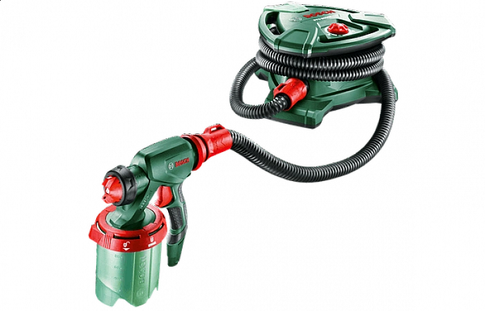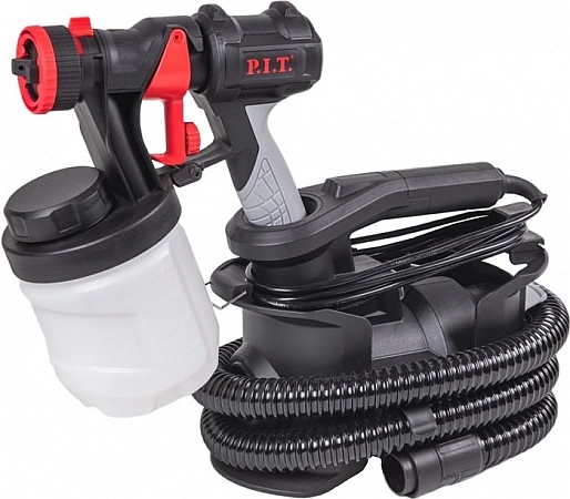 Elektromos szórópisztoly 60 dyn⋅sec/cm² viszkozitású vízbázisú festékekhez kényelmes gumírozott fogantyúval és 2 m-es tápkábellel A pisztoly 400 W teljesítménnyel percenként akár 800 ml anyagot termel. Az előtolás beállítása a finomhangoláshoz biztosított. A készlet két 1,8 és 2,6 mm-es fúvókát tartalmaz különböző festékekhez, antiszeptikumokhoz, alapozókhoz, olajokhoz és lakkokhoz. A vélemények alapján látható, hogy a szórópisztoly könnyen tisztítható, csak szétszerelve és összeszerelve. A kezdőknek nincs vele gond. A falak festésekor a tartályt 100% -kal, a mennyezetek feldolgozásakor pedig 60% -kal ürítik ki.Az elektromos permetező kényelmesen használható függőleges széles és keskeny felületeken, például lugasok rácsos falain és kültéri teraszokon. De mivel a fúvóka és a tű műanyagból készült, a készülék nem alkalmas gyakori használatra.