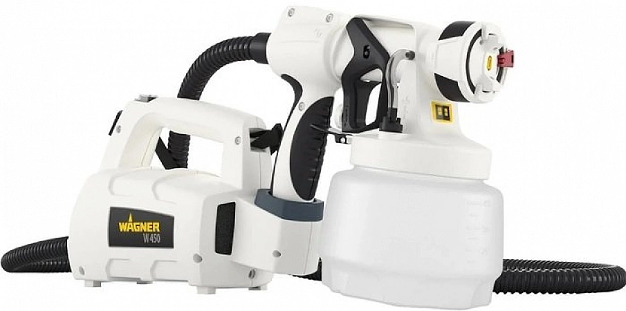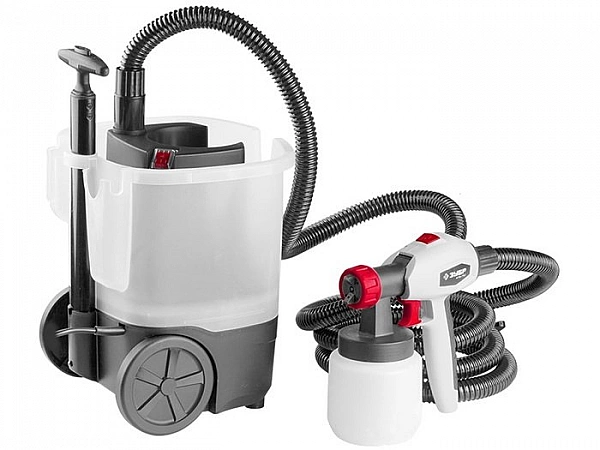 Az elektromos szórópisztoly egy nagy, 900 ml-es alsó tartállyal és egy távoli pumpával rendelkezik. Utóbbiban van egy pisztoly állvány. A készlet két darab 2 és 3 mm átmérőjű, tartós műanyagból készült fúvókát tartalmaz. Minden csatlakozás tömített. A távoli szivattyú 1,8 m-es tömlővel csatlakozik a permetezőhöz - ha az alapot az asztalra szereli, elegendő egy 2,5 m-es alacsony mennyezet festése, hogy ne tartsa a szivattyút a kezében. Az anyagadagolás maximum 1 l/percig állítható. A tulajdonosok beszámolóiban arról számoltak be, hogy a pisztoly fogantyújának szöge kényelmes tartást biztosít a szórópisztoly számára a mennyezet és a falak festésekor. A kéz nem fárad el a hosszú távú használat során. A 60 dyn⋅s/cm² viszkozitásnak köszönhetően semmi sem folyik a függőleges felületeken, de az elektromos szerszámot vastagabb kompozíciókhoz is tervezték – akár 100 dyn⋅s/cm²-ig.
