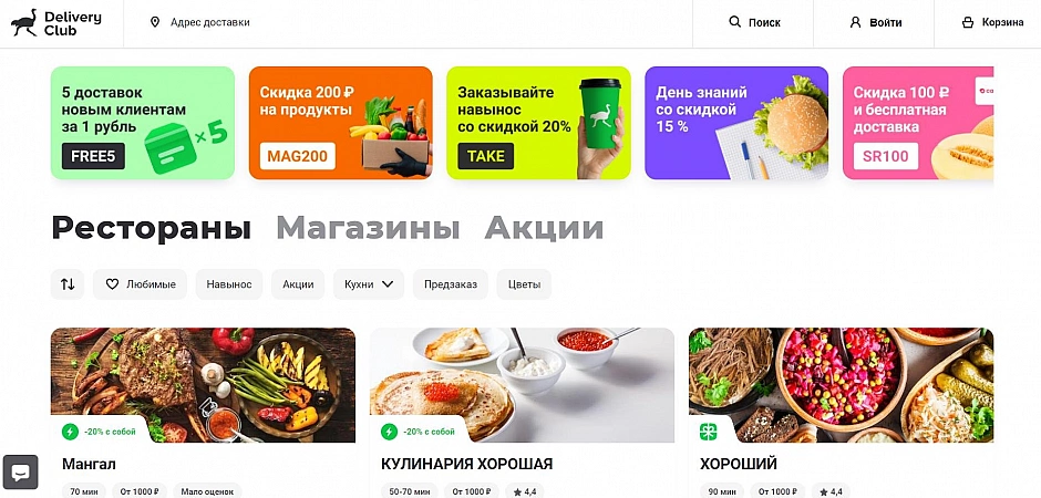 "Delivery Club" menawarkan diskon besar dan kode promo untuk pelanggan baru dan reguler yang tidak dimiliki perusahaan lain. Memesan di sini bahkan lebih menguntungkan daripada langsung dari kafe atau restoran.