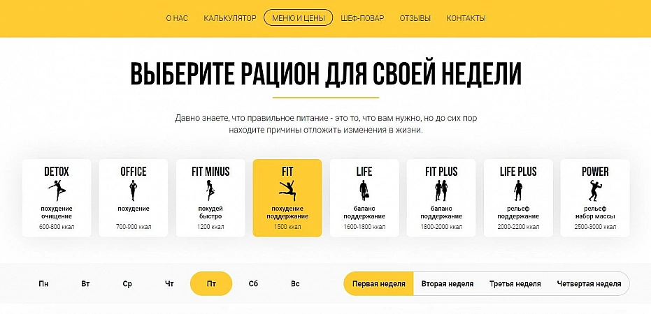 "Makanan Emas" memberikan kompleks lengkap dengan sarapan, makan siang, dan makan malam dengan kandungan kalori yang dihitung dan tingkat protein, lemak, dan karbohidrat yang dibutuhkan. Di sini Anda dapat memilih diet terbaik untuk menurunkan berat badan, mempertahankan bentuk, dan menambah massa.