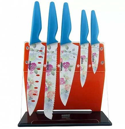 Bekker è erroneamente considerato da alcuni un marchio tedesco. In effetti, questa è una società russa. È apparso sul mercato nel 2000. Per più di 20 anni di lavoro, è diventata piuttosto famosa, principalmente per i piatti economici e belli da cucinare e servire. I coltelli Bekker sono meno conosciuti, ma si trovano spesso nei negozi.La scelta è piccola anche sul sito ufficiale. Ci sono pochi coltelli separati, più spesso vengono venduti immediatamente in set completi di supporto. Il prezzo di un set raramente supera i 2000 rubli. Bekker può essere considerato un'opzione economica per la cucina di tutti i giorni. Ma non dovresti contare su una qualità eccellente: l'acciaio utilizzato non è dei migliori, devi affilare periodicamente i coltelli.