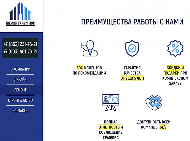 חברת "הנדסה דרום" צעירה יחסית, אבל כבר די פופולרית ומתהדרת במוניטין טוב בשוק הבנייה והתיקונים. כאן הם מאוד זהירים בבחירת כוח האדם.ראשי החברה פועלים בכיוון זה יותר מ-12 שנים, הם אספו סביבם צוות של אנשי מקצוע מנוסים. צוותי בנייה ותיקון מסוגלים לבצע עבודות בכל מורכבות, להתמודד עם חומרים מורכבים ותובעניים. בחברת "הנדסה דרום" הם מעוניינים לא רק בתועלת שלהם, הם לא שוכחים את הלקוח כאן. הנחה טובה זמינה ללקוחות עבור חומרי גמר גסים ומשובחים, כך שסכום האומדן מצטמצם ללא אובדן איכות. התיקונים מבוצעים בצורה מצפונית, מקום העבודה תמיד מסודר, מה שצוין לעתים קרובות בביקורות של לקוחות. בין החסרונות: לא תמיד הם עומדים בזמנים, יש חריגות בהערכה, אין מחירון ברור שאפשר להתמקד בו.