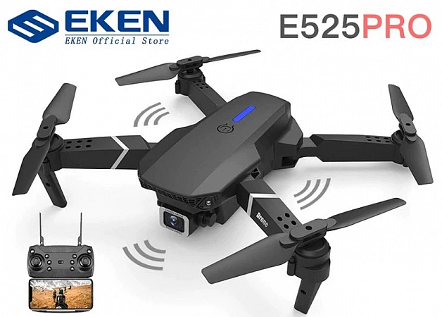 Kitas populiarus biudžetinio segmento modelis yra EKEN E525 PRO. Jis turi visas pagrindines keturkopterio savybes: skraidymą vartotojo nubrėžtu keliu, automatinio grįžimo mygtuką ir 360° pasukimą. Trys jutikliai skirtingose drono pusėse yra atsakingi už kliūčių išvengimą. Galite fotografuoti ir žiūrėti vaizdo įrašus realiuoju laiku. Galinga baterija užtikrins vidutinę skrydžio trukmę. Ketvirčio valandos užtenka padaryti gražius kadrus ir išmokti skraidyti dronu. Pagrindiniai atsiliepimuose minimi trūkumai – lėtas pristatymas ir ne pati patikimiausia pakuotė. Dėl šios priežasties periodiškai turite rašyti pardavėjui ir reikalauti pakeisti sugedusias dalis.