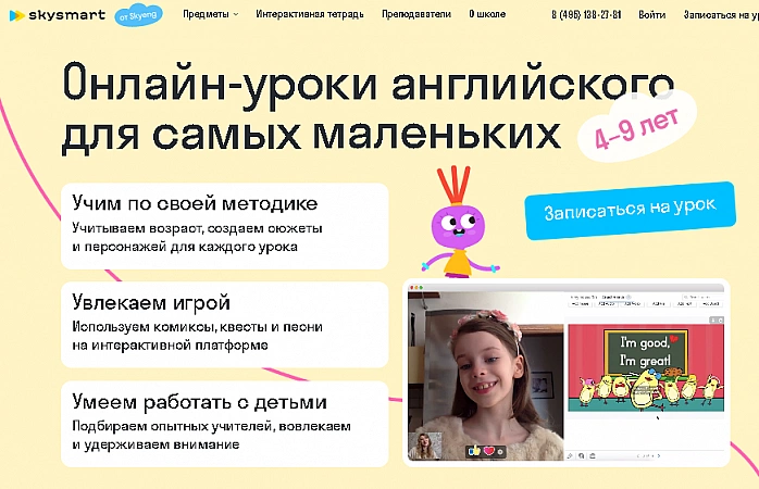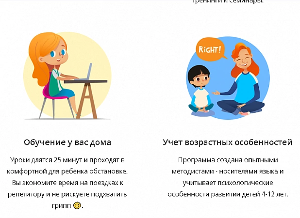 Labs variants maziem bērniem no 4 gadiem. Nodarbības ir īsas, sākas no 25 minūtēm, notiek izklaidējošā veidā. Varat reģistrēties izmēģinājuma nodarbībai, lai noskaidrotu, vai tā jums ir piemērota. Apmācības vada gan krievvalodīgie skolotāji, gan skolotāji no ASV un Anglijas. Nodarbības izmaksas ir no 225 rubļiem, jāmaksā par 5 nodarbību komplektiem. Jo vairāk nodarbību tas ietver, jo izdevīgāka ir cena. Arī izmaksas ir atkarīgas no skolotāja līmeņa, nodarbības ar angliski runājošiem skolotājiem maksās no 750 rubļiem par stundu. Spriežot pēc atsauksmēm, vecāki ir apmierināti ar visu, izņemot tiešas komunikācijas trūkumu ar skolotāju un retās tehniskās kļūmes.