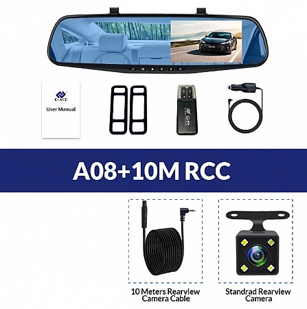 Ретровизор Е-АЦЕ А08 је савршена комбинација цене, квалитета и функционалности. Постоји дигитални зум, Г-сензор, сензор покрета, заштита од воде и вибрација. За бољи квалитет слике користи се двоструко сочиво са аутоматским балансом белог. Постоји функција истовременог снимања са 2 камере. Видео снимци се чувају на меморијској картици до 32 ГБ. Када се напуни, ауто диктафон ће наставити са снимањем, али ће нови фајлови заменити старе. Да бисте спречили брисање важних видео записа, морате их послати у посебну фасциклу. Купци АлиЕкпресс-а нису задовољни што видео снимци заузимају превише простора за складиштење. Препоручује се да изаберете картицу са максималним капацитетом.