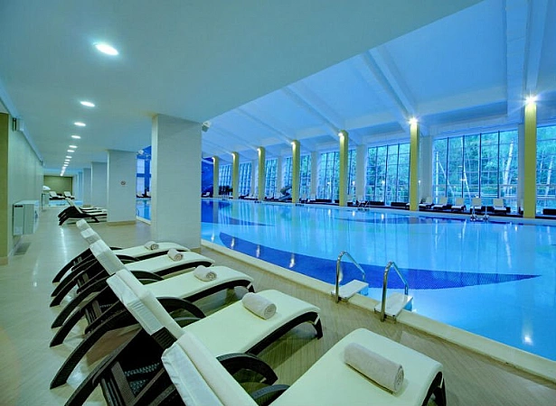 Det fyrstjärniga hotellet ligger i ett pittoreskt skogsområde, omgivet av vacker natur. Den har ett stort angränsande territorium med utmärkt infrastruktur. Det finns ett SPA, ett badkomplex, en stor pool med varmt vatten. Det finns många underhållningar för barn, de kan lämnas i barnrummet under noggrann övervakning av pedagoger. Vuxna kommer också att hitta något att göra - bowling, biljard, ett fitnesscenter, barer, minigolf och mycket mer. All inclusive-boende ger många fördelar - gratis måltider (buffé), pooler, SPA-komplex, underhållningsprogram. Men vissa gäster är inte nöjda med ljudisoleringen i rummen och kvaliteten på städningen. Höga kostnader kan också hänföras till nackdelarna.
