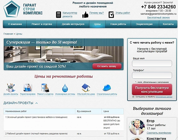 Ang "Garant Stroy Complex" ay isang kumpanya sa pagsasaayos ng apartment sa Samara na may magandang reputasyon. Ang mga tao ay pumupunta rito pangunahin para sa mga eksklusibong proyekto sa disenyo at pagtatapos ng turnkey. Ang kumpanya ay may isang mahusay na koponan ng mga taga-disenyo na hindi nag-iiwan ng walang malasakit kahit na ang pinaka-hinihingi na mga customer. Sa site maaari mong makita ang portfolio, na nagpapakita ng mahusay na trabaho. Ang halaga ng mga serbisyo ng Garant Stroy Complex ay hindi ang pinakamaliit, ngunit ang mga regular na promosyon at mga espesyal na alok ay nakakatulong upang makatipid ng pera. Gumagana lamang ang kumpanya sa mga de-kalidad na materyales sa pagtatapos at nag-aalok ng mga customer ng mga paborableng diskwento dito. Nagbibigay ang kumpanya ng mga serbisyo nang walang mga tagapamagitan, mayroon itong sariling mga full-time na koponan, na binubuo ng mga high-class na manggagawa. Ang pangunahing kawalan ay ang mababang interes sa mga customer. Dito, ang mga maliliit na order na mababa ang badyet ay halos hindi nagagawa.