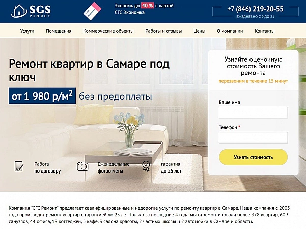 Mula noong 2005, ang mga serbisyo para sa pagkumpuni at dekorasyon ng mga apartment sa Samara ay inaalok ng kumpanya ng SGS Remont. Ang mga proyekto ng anumang kumplikado ay kinuha upang gumana dito. Mula sa pagkukumpuni ng disenyo sa isang bagong gusali hanggang sa pagkukumpuni ng kosmetiko sa pangalawang real estate. Nagtatrabaho sila rito nang buong tapat, nang walang mga tagapamagitan at mga kontrata ng third-party. Ang mga full-time na brigade ay binubuo ng mga may karanasang napatunayang craftsmen. Ang mga customer sa mga review ay tandaan na ang mga espesyalista ay talagang kwalipikado, sila ay gumagana nang tumpak at mahusay. Maaari kang tumawag sa isang tagasukat at gumawa ng pagtatantya nang libre. Kung ang kliyente ay nasiyahan sa lahat, ang isang kontrata ay iginuhit, na tumutukoy sa halaga ng pag-aayos at mga tuntunin. Bilang isang patakaran, ang kumpanya ay sumusunod sa lahat ng mga kondisyon na inireseta sa dokumento. Ang halaga ng mga serbisyo ay medyo katamtaman, ang pag-aayos ng kosmetiko ay nagkakahalaga mula sa 1980 rubles / m2, taga-disenyo ng turnkey - mula sa 6780 rubles / m2. May mga reklamo tungkol sa kalidad ng serbisyo, ang mga tagapamahala ay hindi masyadong magalang, sila ay nag-aatubili na tumugon sa mga reklamo.