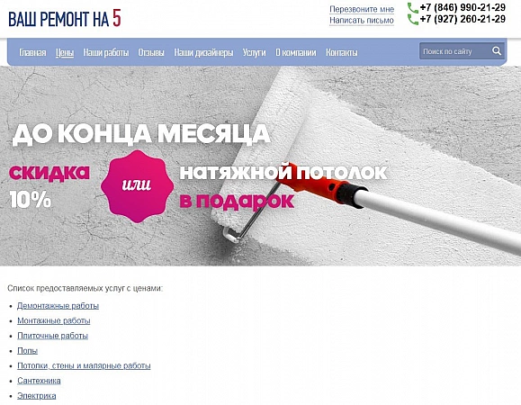 Ang rating ng pinakamahusay ay ipinagpatuloy ng isa pang kumpanya na nag-aalok sa mga residente ng Samara ng mataas na kalidad na kosmetiko at pag-aayos ng taga-disenyo ng anumang pagiging kumplikado. Gumagana ang kumpanya sa mga hindi karaniwang proyekto at hinihingi na mga materyales. Ang mayamang karanasan ng mga master ay nagbibigay-daan sa amin upang maisagawa ang trabaho na may pinakamataas na kalidad at sa oras. Sa bawat yugto ng pag-aayos, ang maingat na kontrol ay isinasagawa, ang kliyente ay tumatanggap ng mga regular na ulat at maaaring personal na bisitahin ang bagay anumang oras. Ang pagbabayad ay unti-unti, dahil ang mga serbisyong inireseta sa kontrata ay nakumpleto. Ang kumpanya na "Your repair for 5" ay nagmamalasakit sa reputasyon nito, ang lahat ng trabaho ay isinasagawa sa mahigpit na alinsunod sa GOST. Ang halaga ng mga serbisyo ay medyo mataas, lalo na para sa pagpapatupad ng mga proyekto sa disenyo ng turnkey. Gayunpaman, napansin ng maraming mga customer na ang kalidad ay medyo pare-pareho. Pinapayuhan na suriin ang kasalukuyang listahan ng presyo sa sales manager, dahil ang mga presyong ipinakita sa site ay hindi isang alok at madalas ay luma na.