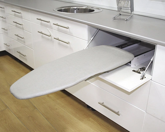 Bàn ủi có thể thu vào có thể được đặt phía sau một trong các cánh cửa của nhà bếp, trên một trong các giá trong phòng thay đồ hoặc trong tủ quần áo ở bất kỳ phòng nào. Nó có thể gập lại, và một hốc có độ sâu từ 49 cm trở lên là đủ. Đồng thời, khi tháo rời, bề mặt ủi có kích thước 126 x 30 cm - khá đủ để ủi thoải mái.Mặt bàn bằng gỗ và không có giá đỡ đặc biệt không cho phép sử dụng máy xông hơi, nhưng việc hấp đồ bằng bàn ủi thông thường trên đó khá thoải mái. Bảng có thể được đặt ở độ cao thoải mái để làm việc, nhưng tất nhiên, sẽ không thể điều chỉnh được. Mẫu không đi kèm giá ủi tay áo nhưng bạn có thể dễ dàng mua riêng.