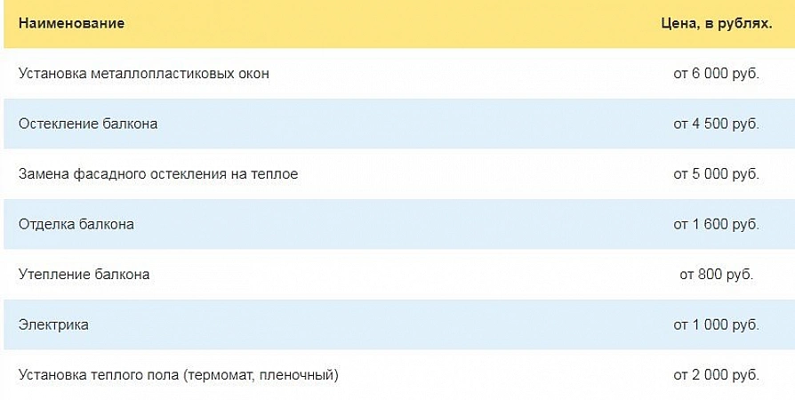 冷玻璃的平均服务成本为每平方米 3,500 卢布。由于使用了两室或三室双层玻璃窗,温暖的成本将增加约 1000-1500 卢布。完成阳台的成本从每平方米 1400 卢布开始。通常,该领域市场上的公司在其领域提供全方位的服务,这意味着您无需考虑细节并订购交钥匙阳台或凉廊。