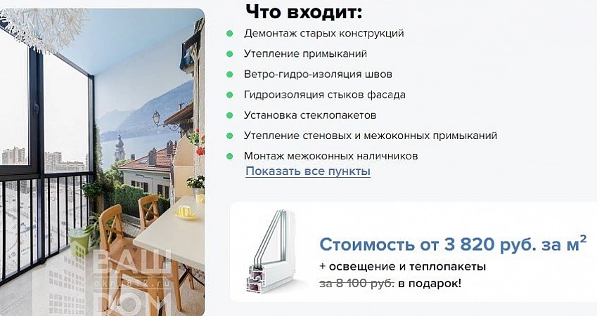 Vash Dom 是圣彼得堡另一家知名的玻璃阳台和凉廊公司。该公司在其领域提供广泛的服务。客户可以订购冷或暖玻璃,外部和内部装饰,将阳台变成一个成熟的生活空间。以交钥匙方式订购时,定期提供优惠优惠,根据条件,客户可以收到温暖的地板或装饰照明作为礼物,等等。根据评论,这里的工作很认真,安装人员很整洁,经验丰富。在缺点中,客户注意到整理阳台的高成本,以及延误和延误,但后者并不经常发生。